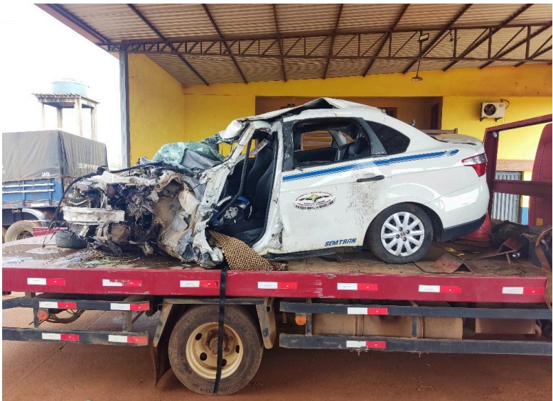 O táxi que tinha em seu interior cinco pessoas colidiu na lateral dianteira do caminhão e foi atirado para fora da pista e capotou, como você pode ver na dinâmica do acidente representada no croqui, o caminhão também perdeu o controle e saiu para o mesmo lado da via.
