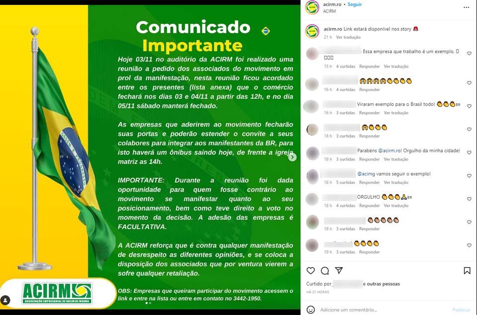 Isto, especificamente, para que as empresas fechem suas portas e passem a integrar – donos e colaboradores –, aos movimentos antidemocráticos nas BRs do estado.