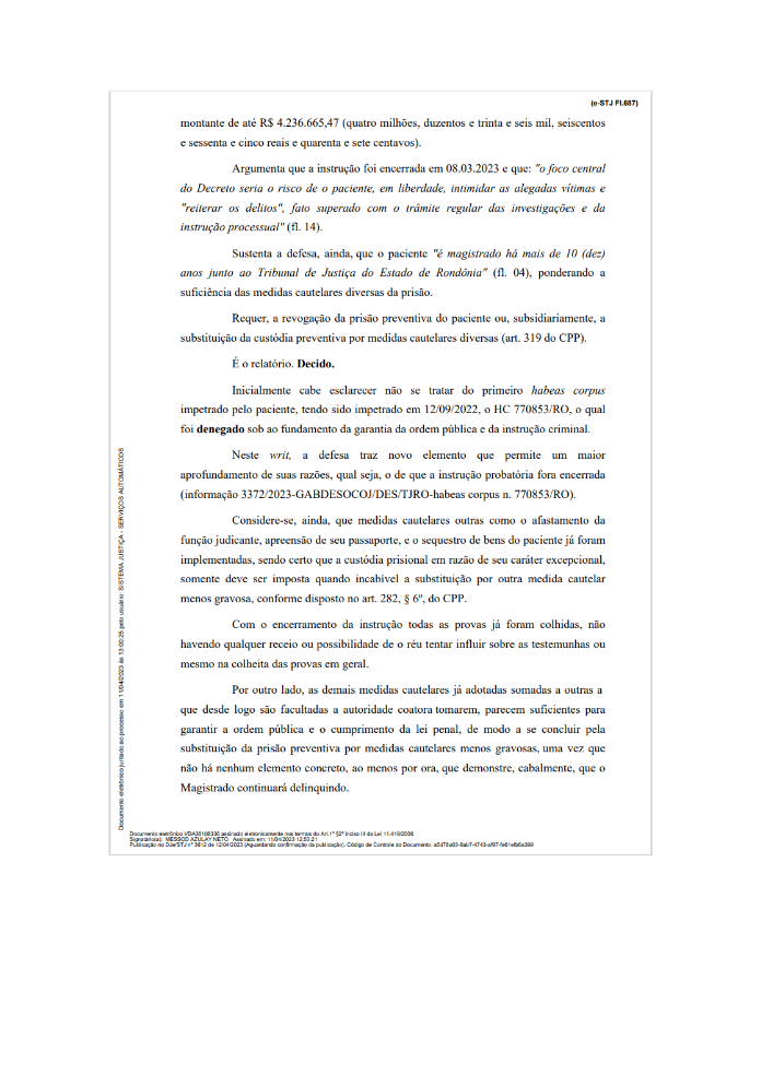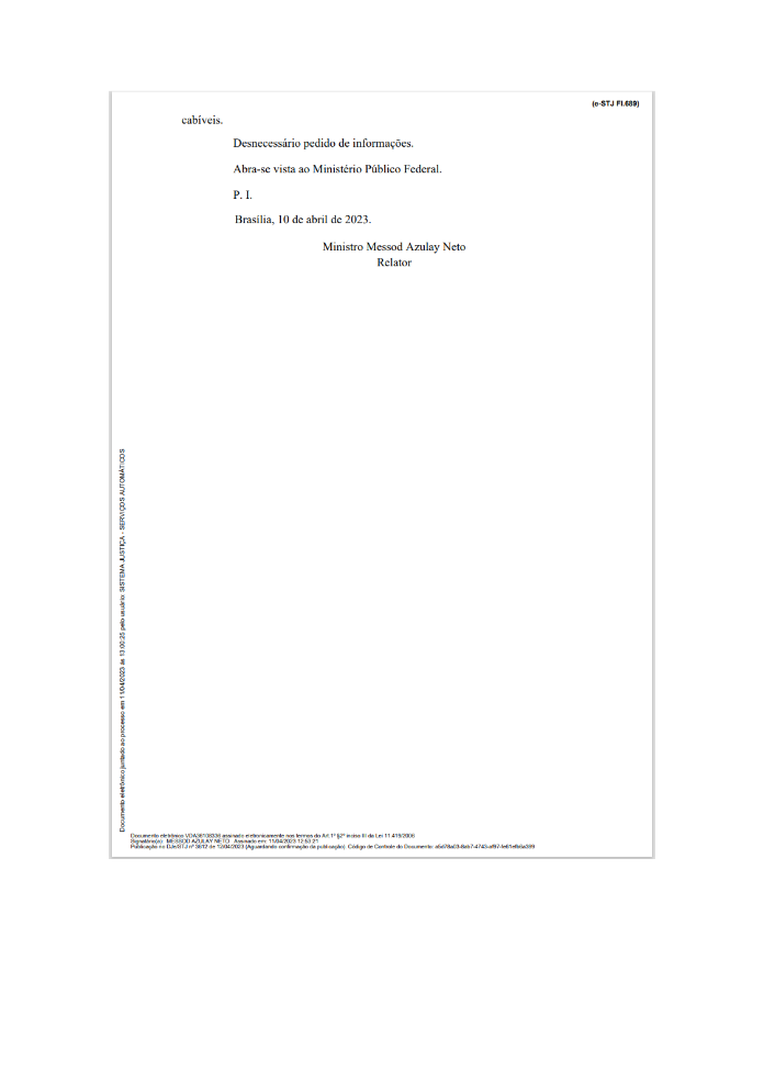 A decisão, prolatada pelo ministro Messod Azulay Neto, saiu na última segunda-feira (10), mas até a noite desta terça-feira ainda não aparecia no site do STJ.