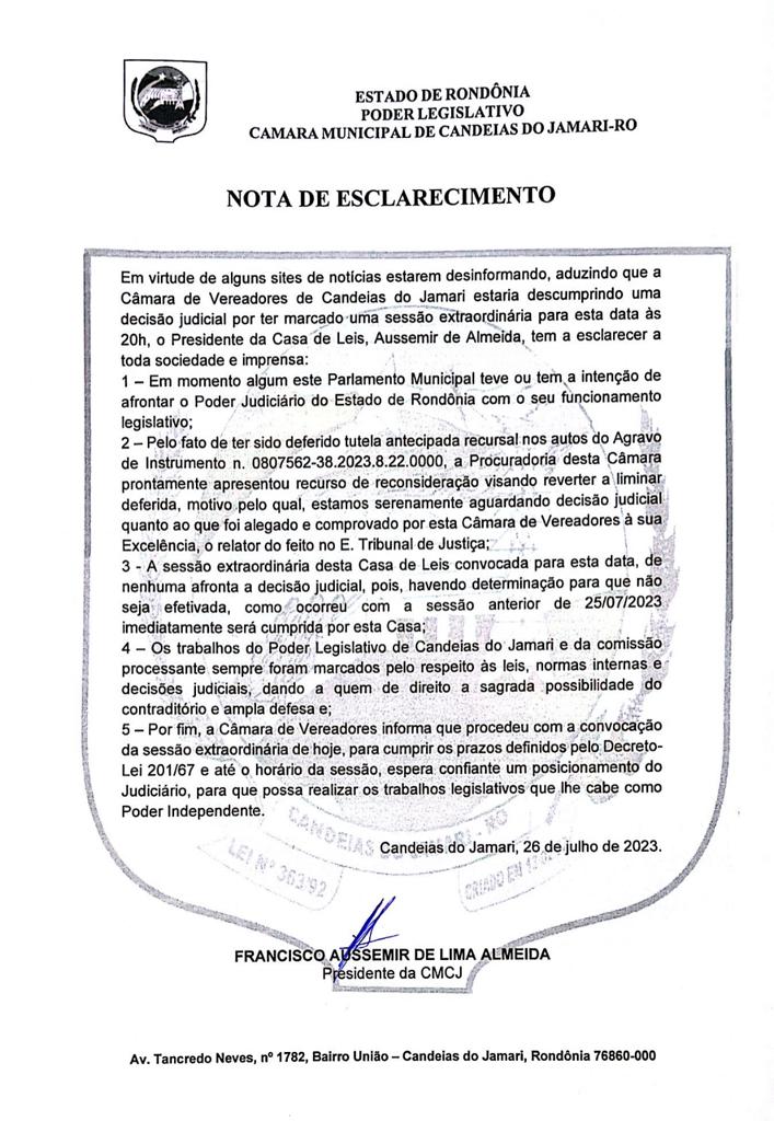 No começo da tarde desta quarta-feira (26), o presidente da Câmara de Vereadores de Candeias do Jamari, Francisco Ausssemir de Lima (PSB), divulgou uma nota de esclarecimento sobre a sessão marcada para às 20 horas do mesmo dia, que deve definir a cassação ou não do prefeito afastado pela Justiça, Valteir Queiroz (União Brasil).