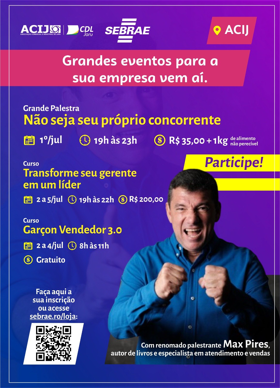 Concomitantemente, entre os dias 02 e 05 de julho, será ministrado o curso “Transforme Seu Gerente Em Um Líder”, que acontecerá também no auditório do Sebrae em Jaru. Vale destacar que tanto os cursos, como a grande palestra, serão ministrados por Max Pires, conhecido como “o encantador de clientes”.