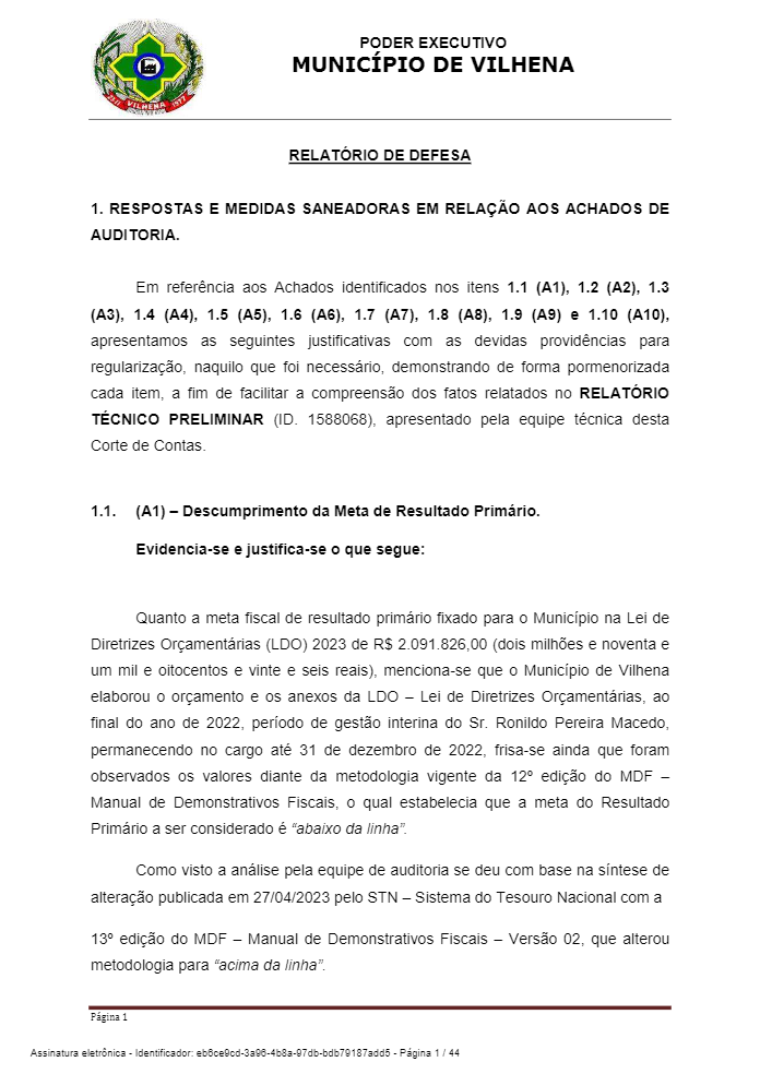 A prefeitura de Vilhena apresentou defesa e informou que “diante dos achados detectados, foram tomadas as devidas providências junto aos setores técnicos pertinentes”.