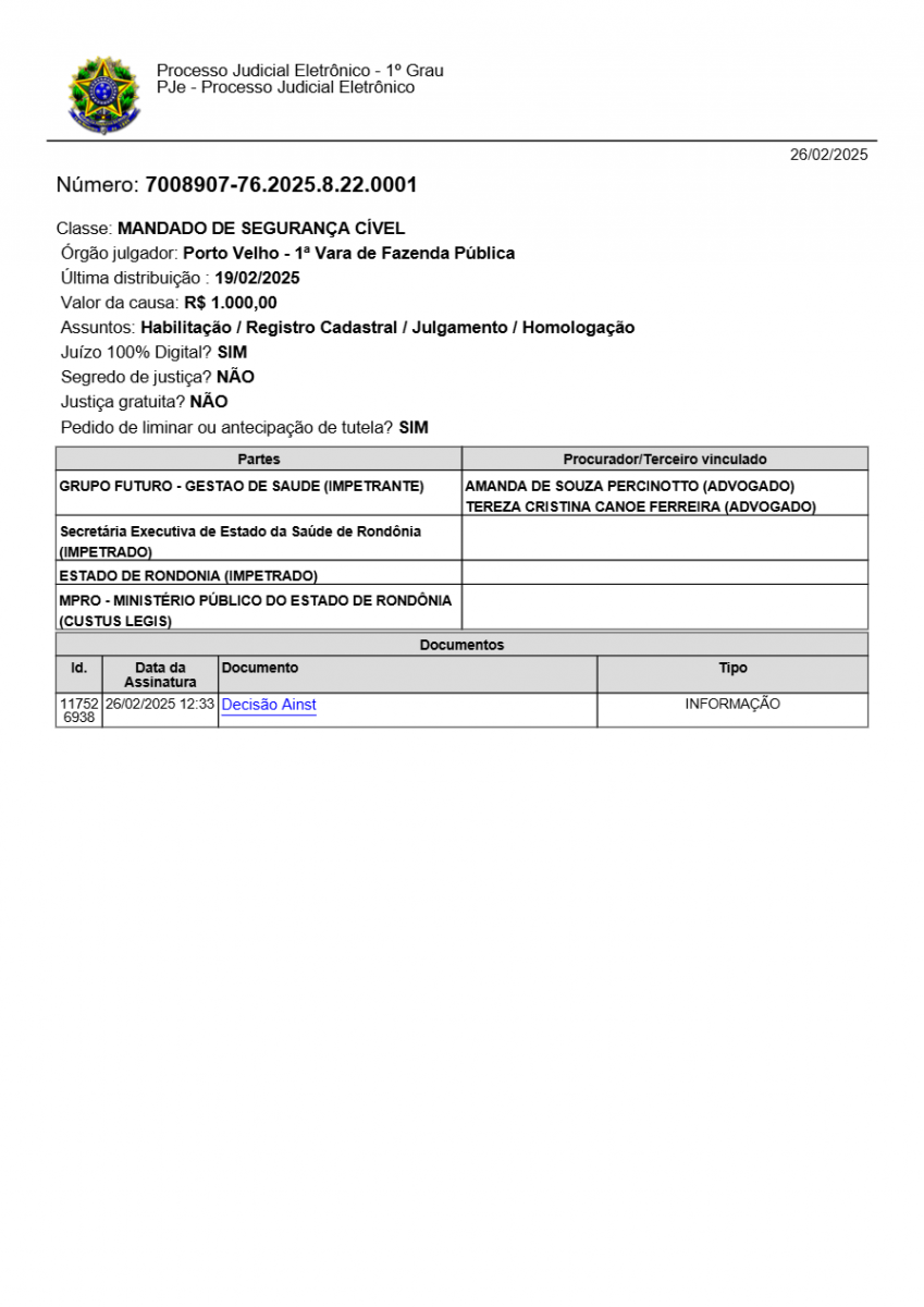 Com a decisão, o Grupo Futuro – Gestão de Saúde deverá ser intimado para apresentar contrarrazões. O caso segue para julgamento na 1ª Câmara Especial do TJRO, que decidirá sobre a manutenção ou não da suspensão da licitação.