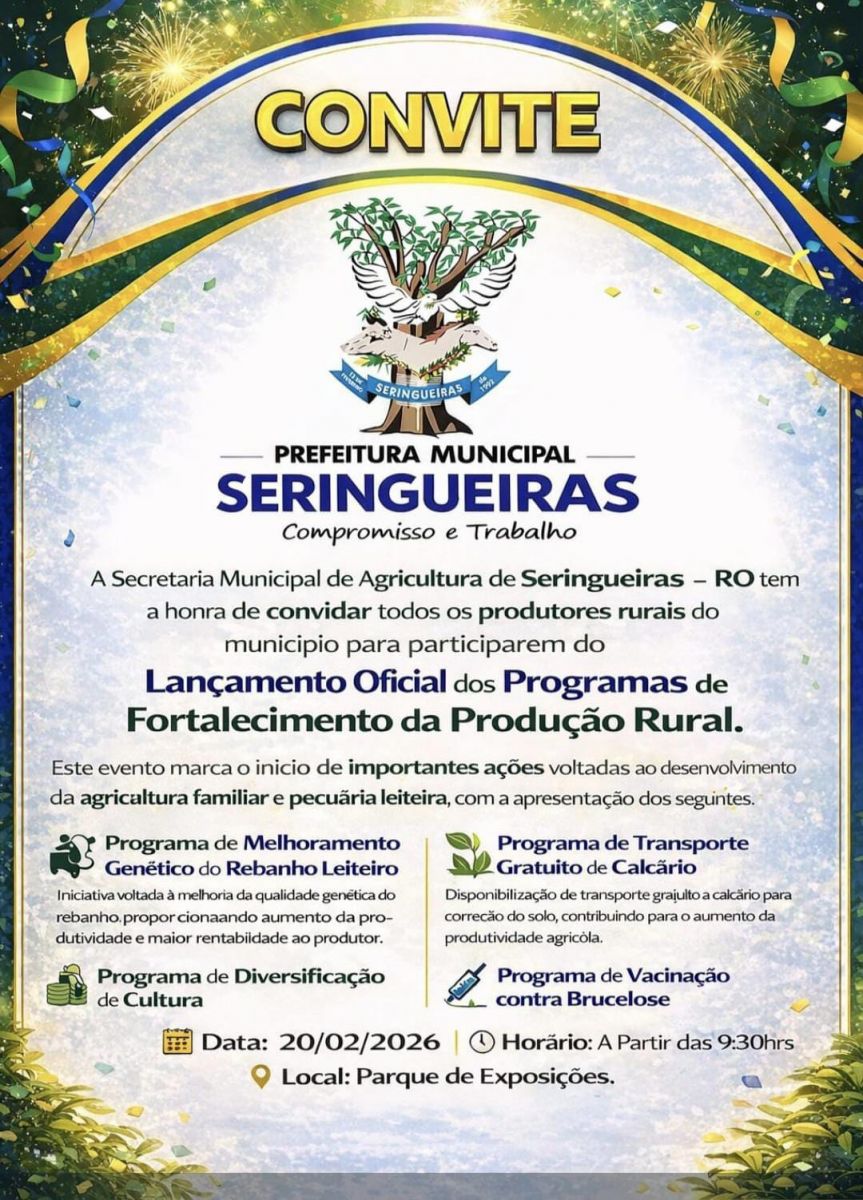 A Prefeitura Municipal de Seringueiras, por meio da Secretaria Municipal de Agricultura, convida todos os produtores rurais do município para participarem do Lançamento Oficial dos Programas de Fortalecimento da Produção Rural.