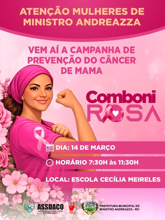 A Associação Assistencial à Saúde São Daniel Comboni (ASSDACO) realizará nesta semana mais uma campanha de prevenção voltada à saúde das mulheres no município de Ministro Andreazza. A ação, denominada Comboni Rosa, está marcada para o dia 14 de março, das 7h30 às 11h30, na Escola Cecília Meireles.