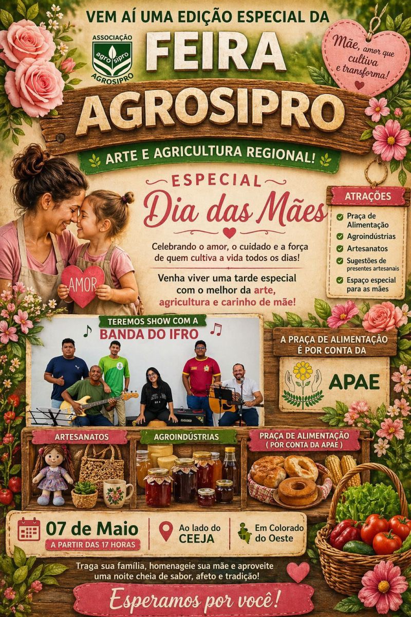 Uma edição especial da Feira Agrosipro será realizada no próximo dia 7 de maio, em Colorado do Oeste, com programação voltada à celebração do Dia das Mães. O evento acontece a partir das 17h, ao lado do CEEJA, reunindo arte, agricultura regional e atrações culturais para toda a família.