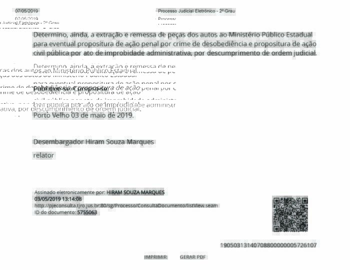 O desembargador Hiram Souza Marques determinou a remessa dos autos ao Ministério Público (MP/RO) para que o órgão proponha ações por crime de desobediência e improbidade administrativa