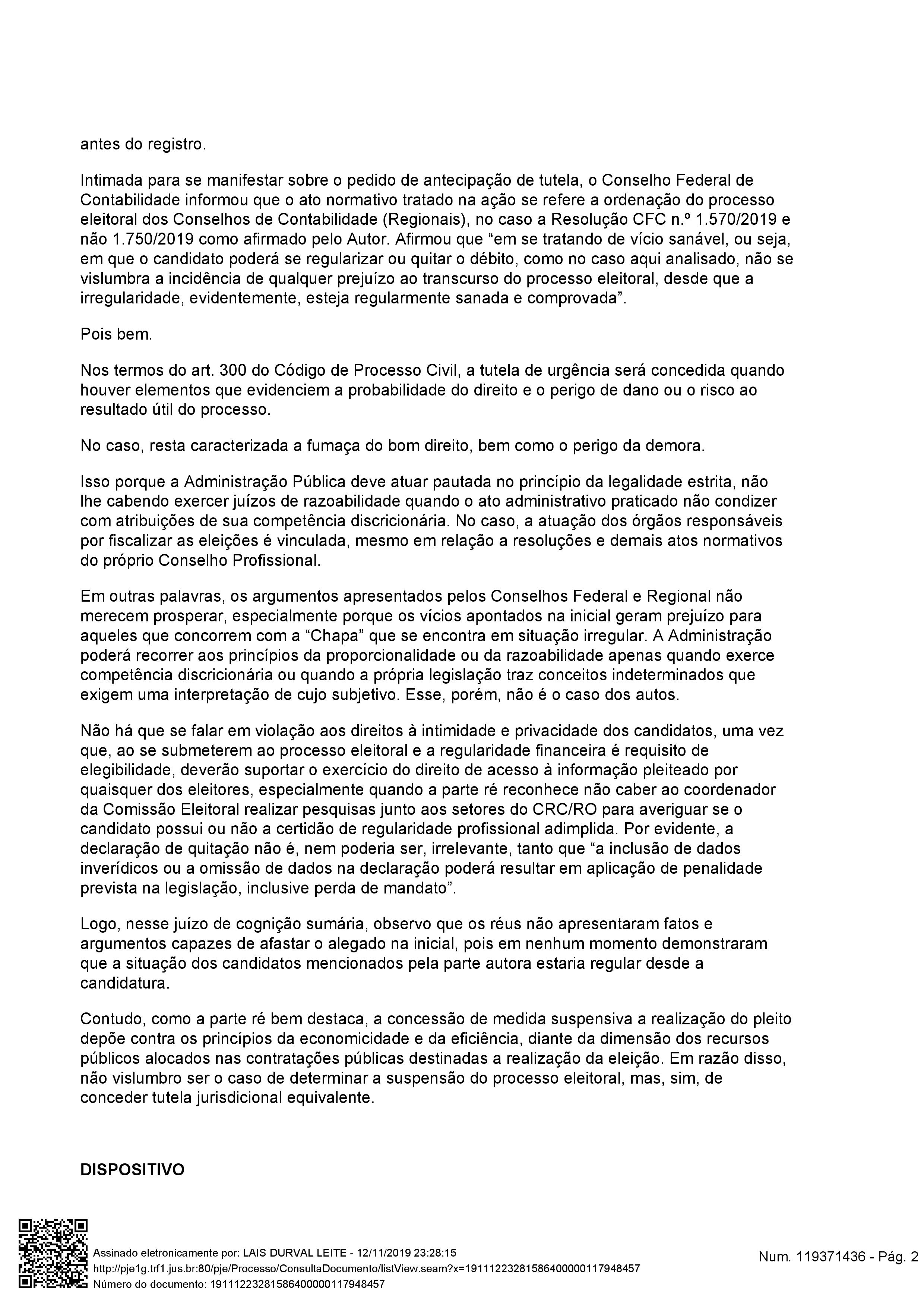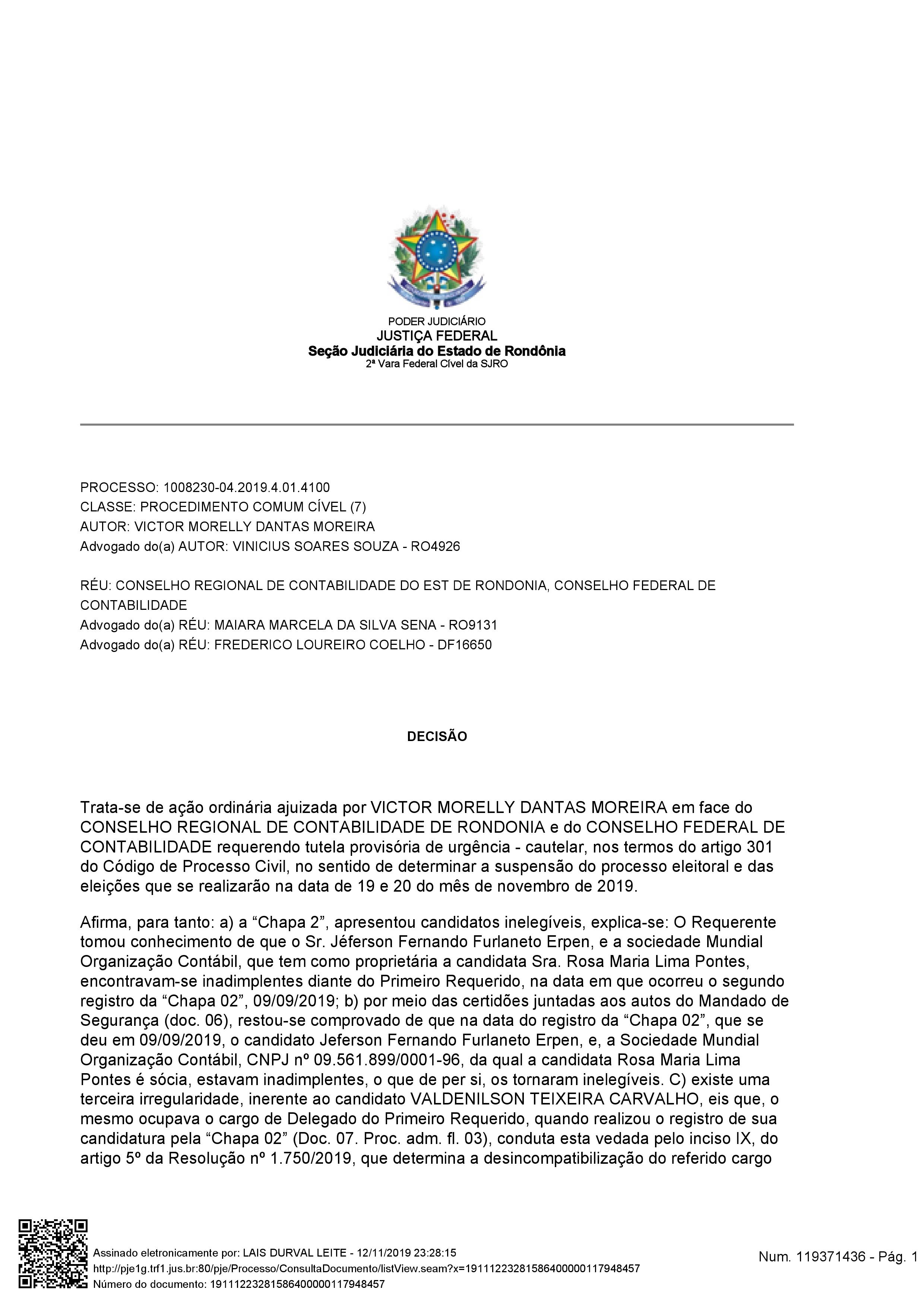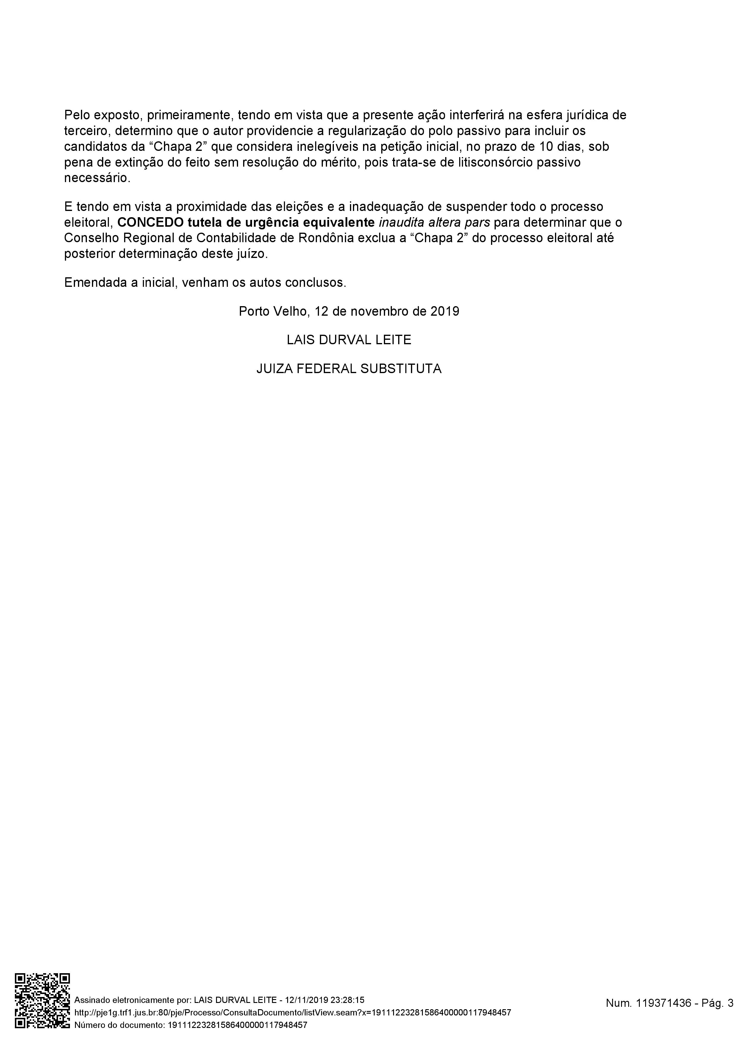 “E tendo em vista a proximidade das eleições e a inadequação de suspender todo o processo eleitoral, CONCEDO tutela de urgência equivalente inaudita altera pars para determinar que o Conselho Regional de Contabilidade de Rondônia exclua a “Chapa 2” do processo eleitoral até posterior determinação deste juízo”, determinou a magistrada.