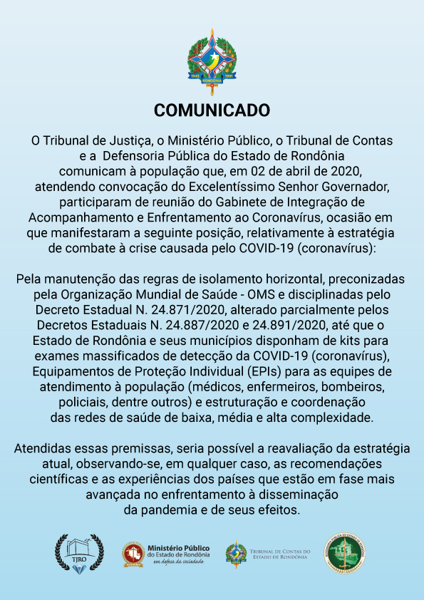 O Poder Judiciário rondoniense atendeu à uma solicitação do Governo do Estado e participou de uma reunião do Gabinete de Integração de Acompanhamento e Enfrentamento ao Coronavírus, em Porto Velho. O objetivo foi conhecer melhor as ações estaduais para combater o Covid-19, já que Rondônia possui uma morte causada pela doença e alguns casos confirmados.