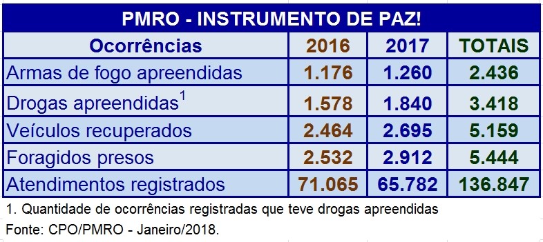 Pela estratégia do Comandante, se aumentar as apreensões de armas de fogo ilegais, aumentar a apreensão de drogas, aumentar a prisão dos foragidos da justiça, e aumentar a recuperação dos veículos roubados ou furtados, certamente, haverá uma redução das ocorrências criminais, pois na maioria dos crimes praticados tem pelo menos um desses fatores envolvidos. Esta tese foi confirmada em 2017, quando todos os indicadores preventivos superaram 2016, e em conseqüência ocorreu uma redução da criminalidade no Estado de Rondônia, na ordem de 7,4%, o que representa uma redução de 5.283 ocorrências policiais a menos, vejamos o gráfico: