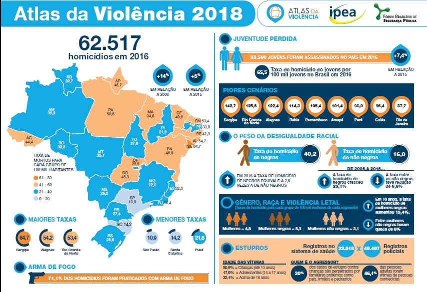 De 2006 a 2016, a taxa de homicídios cresceu 20,2% e 17,2% entre 2015 e 2016. O Norte e o Nordeste ficaram entre os mais violentos, segundo a estatística: Sergipe (64,7%), Alagoas (54,2%), Pernambuco (47,3%), Rio Grande do Norte (53,4%), Pará (50,8%), e Amapá (48,7%) estão no topo da lista. A maioria das vítimas são jovens, de cor negra, uma situação que só vem se agravando a cada ano.