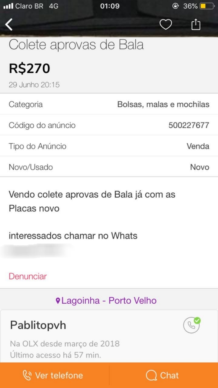 Uma guarnição da Polícia Militar realizava patrulhamento de rotina no momento em que viu um carro modelo HB20 de cor branca com um casal dentro. Como o veículo estava parado, mas ligado foi feita a revista e no banco de trás encontrado o colete. Indagado, o suspeito afirmou ser motorista Uber e o objeto tinha sido esquecido há 13 dias por um amigo que trabalha no Exército Brasileiro. Como o amigo não procurou pelo colete, ele disse que resolveu colocar a venda no OLX.