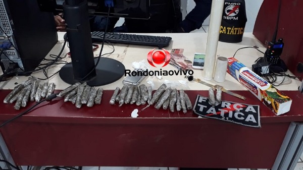 De acordo com informações, policiais militares da Força Tática do 1° Batalhão realizavam patrulhamento preventivo, quando viram um usuário de drogas ao lado da casa. Ele se desfez de uma porção de cocaína. O homem logo informou ter adquirido com uma jovem grávida, Rebeca. Os policiais então fizeram o cerco na casa e o adolescente foi apreendido quando tentava fugir pelos fundos. Com ele foi localizada uma mochila com 42 invólucros de maconha, cinco de cocaína, balança de precisão, um rádio HT na frequência da PM e dinheiro.
