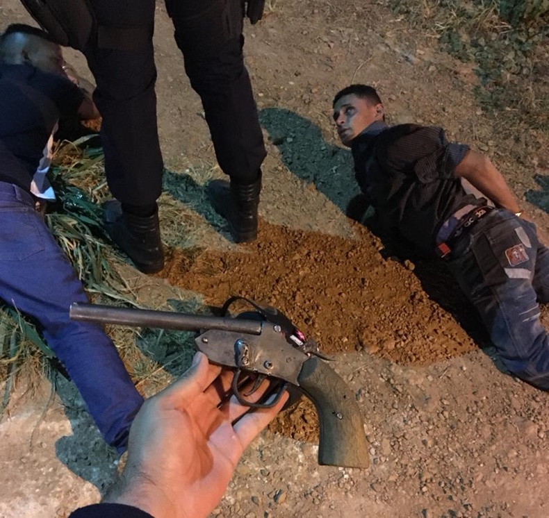 De acordo com informações da polícia, a dupla transitava a pé com dois capacetes nas mãos. Mediante a fundada suspeita, a dupla foi abordada por uma equipe da Polícia Militar, que encontrou com Diemerson uma arma de fabricação caseira e um celular. Os policiais descobriram ligando para um número de telefone na agenda que o aparelho tinha acabado de ser roubado de um homem de 37 anos.