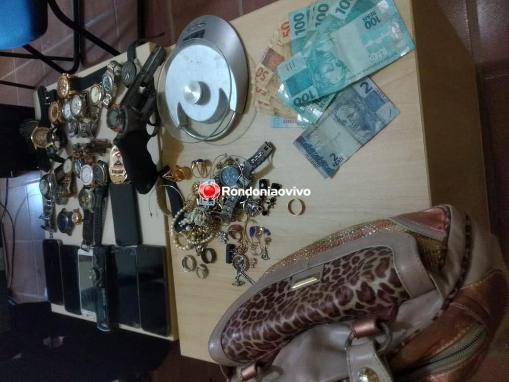 Continuando com as buscas, os policiais localizaram um revólver calibre 38 municiado, além de dinheiro, vários relógios e celulares de procedência duvidosa, que o suspeito alegou ter comprado na Vila Princesa. Sobre a arma, ele disse que era apenas para defesa pessoal, pois já sofreu uma tentativa de homicídio.