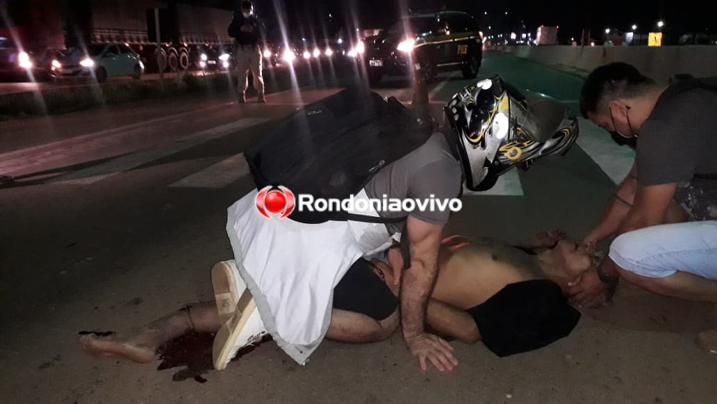 Um homem identificado apenas como Ademar, 57, sofreu grave fratura exposta na perna após ser atropelado por uma motocicleta na noite desta quinta-feira (09) na BR-364, entre a Estrada dos Japoneses e Avenida Guaporé, em Porto Velho (RO).