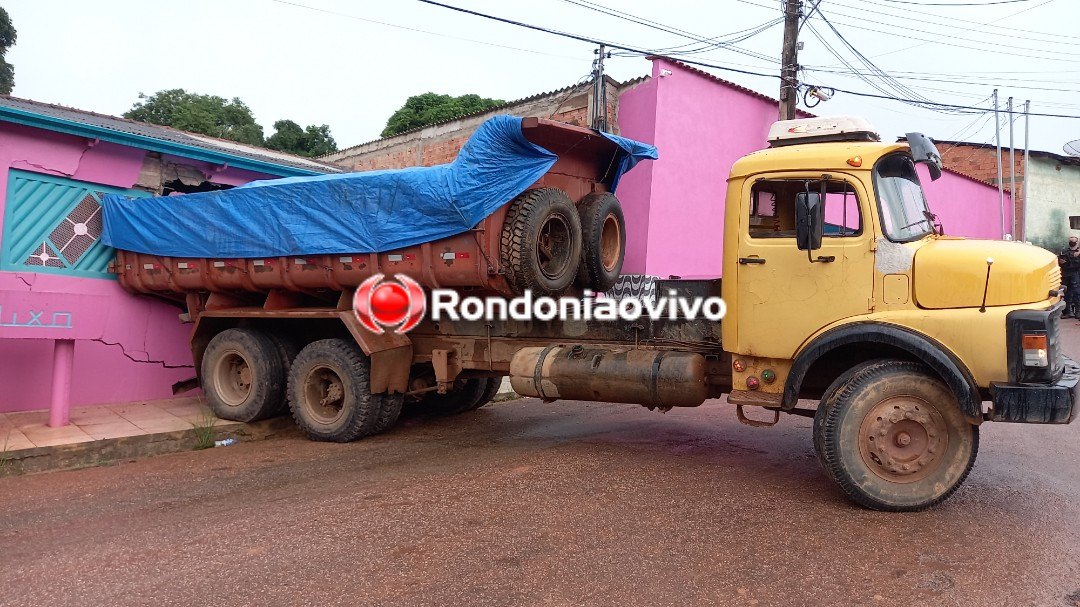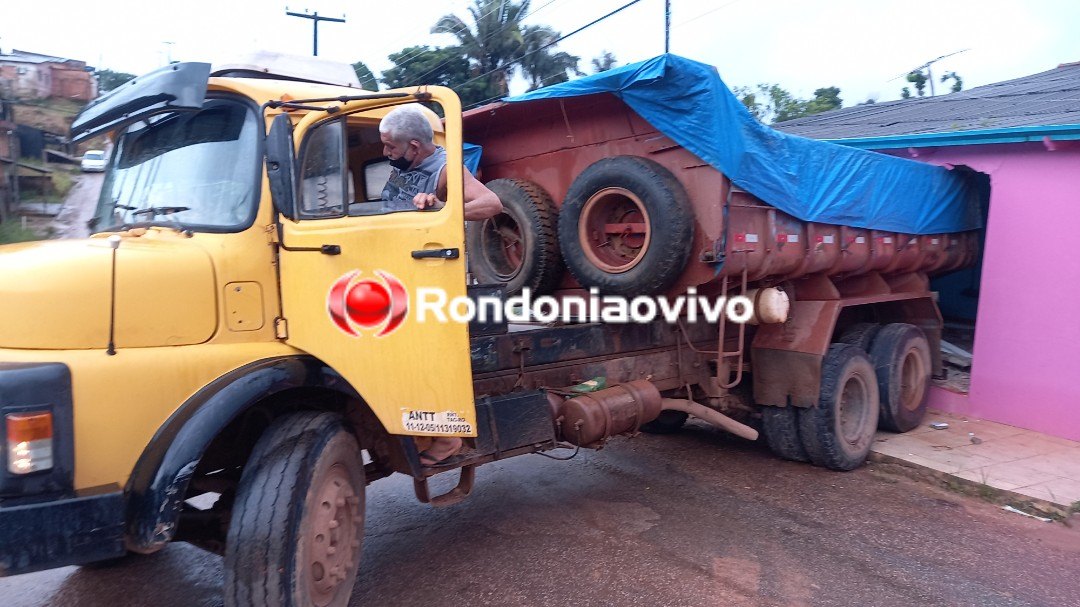 Um caminhão caçamba destruiu a frente de uma residência após descer desgovernado uma ladeira. O motorista contou que com a caçamba carregada estava tentando subir a ladeira existente na rua.