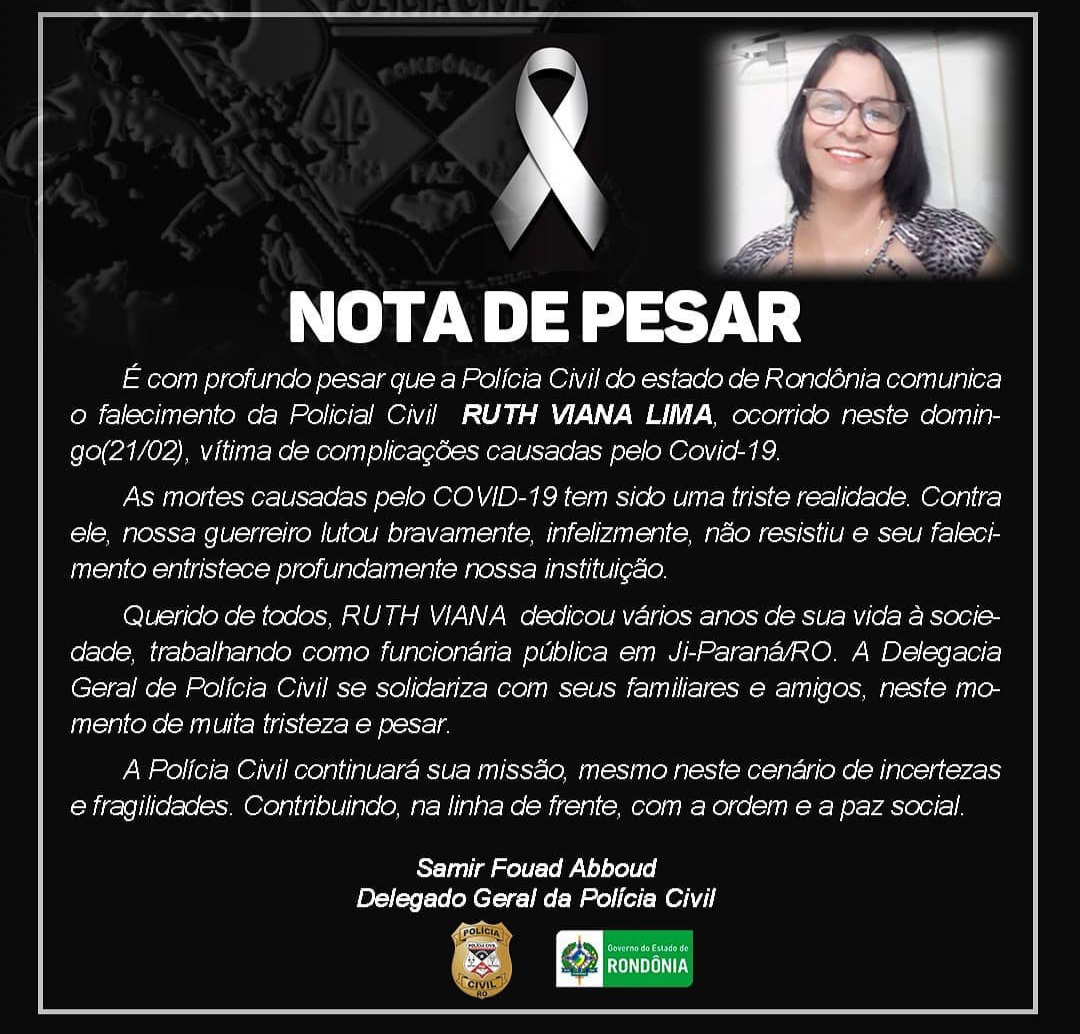 Faleceu neste domingo (21) a policial civil, Ruth Viana Lima, que trabalhava na delegacia do município de Ji-Paraná, em Rondônia.