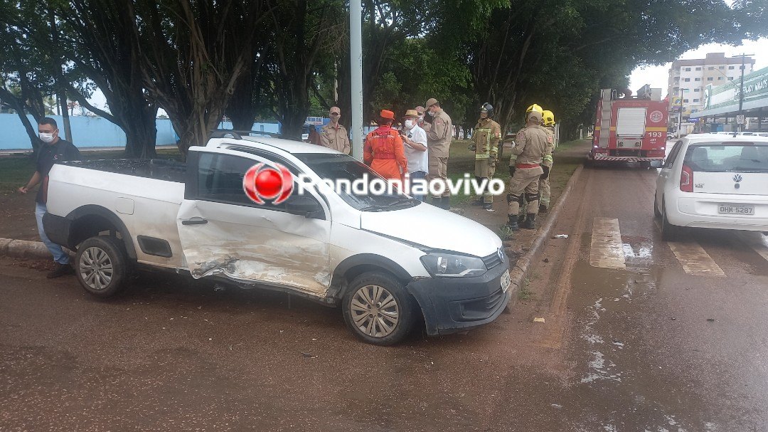 Um carro modelo Up dirigido por um idoso vinha na Calama e bateu na porta do Saveiro, que rodou na pista e colidiu contra a base de sustentação do semáforo.