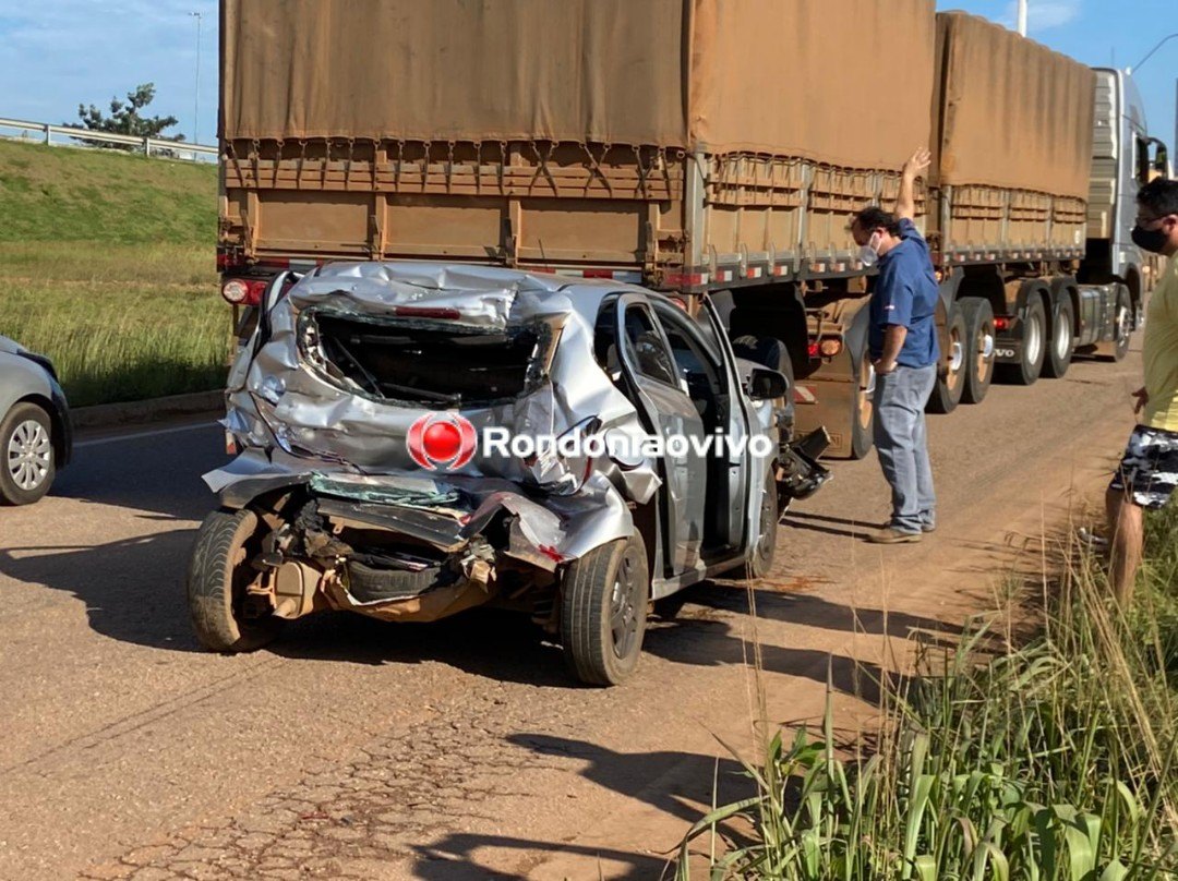 Um carro de motorista de aplicativo foi totalmente destruído por uma carreta e um caminhão baú na manhã desta terça-feira (18) na Rua da Beira, região do Trevo do Roque, em Porto Velho (RO). Duas mulheres foram socorridas ao hospital.