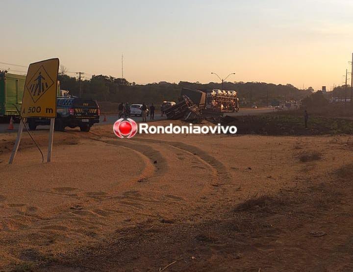 Parte da carga de uma carreta tombou as margens da rodovia e por sorte não houve feridos