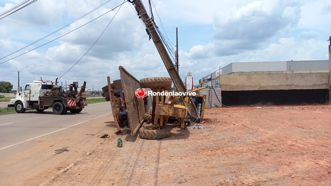 Um caminhão tombou junto com um trator e no incidente um poste foi destruído. Segundo o Rondoniaovivo apurou, o trator havia acabado de ser colocado em cima do caminhão, quando os dois tombaram devido uma inclinação no asfalto.