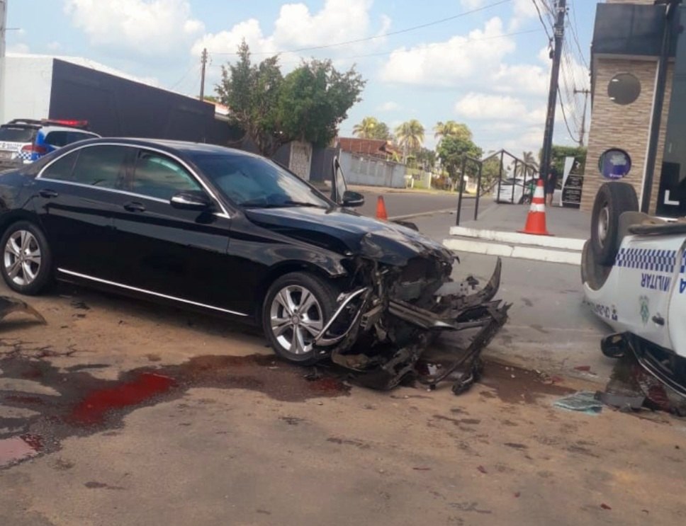 Com o impacto da batida, a viatura virou na pista parando com as rodas para cima. A frente do veículo Mercedes C180 ficou completamente destruída.