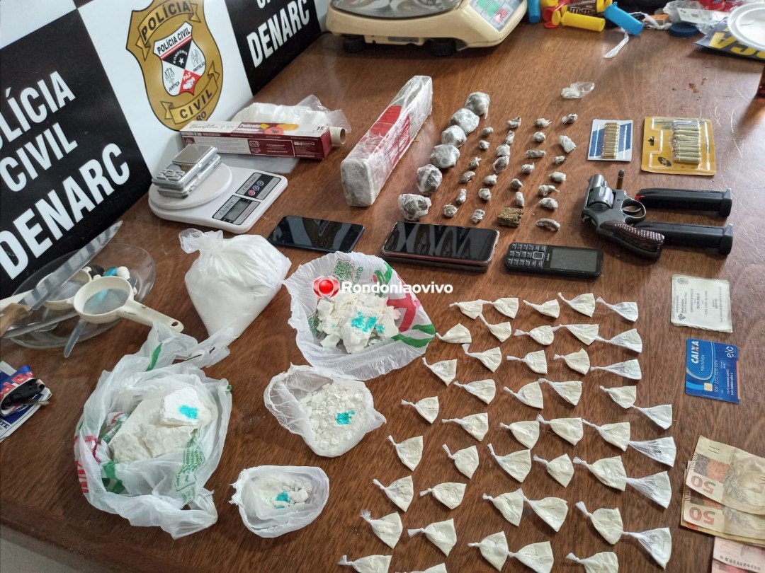 No local, os policiais civis do Departamento de Narcóticos (Denarc) apreenderam aproximadamente dois quilos de drogas, entre maconha e cocaína