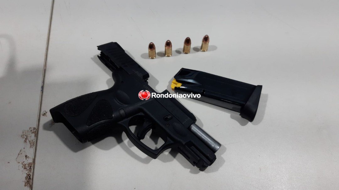 Uma pistola calibre 9mm foi apreendida com o homem escondida no quarto do casal. Ele informou não ter registro da arma e tinha comprado recentemente de um desconhecido por R$ 7.500,00.