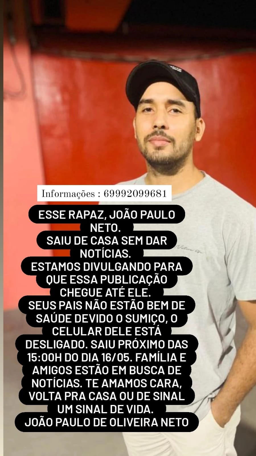 Familiares estão em busca de informações sobre o paradeiro de João Paulo de Oliveira Neto, 34, desaparecido desde a última segunda-feira (16) da residência onde morava na Rua Geraldo Ferreira, bairro Agenor de Carvalho, na capital de Rondônia.