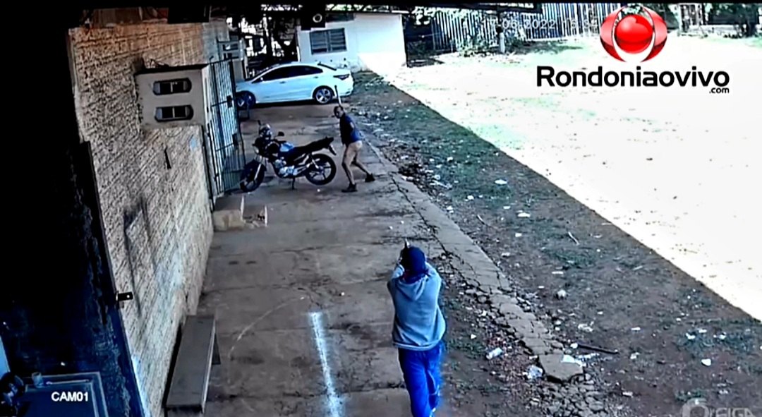 Câmera de monitoramento registrou o momento em que um policial penal é baleado na perna por criminosos em uma metalúrgica na Rua Laranjeiras, bairro Castanheira, na zona Sul de Porto Velho (RO).