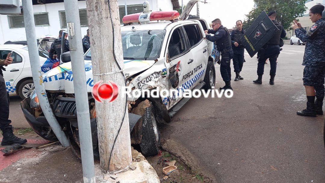 Três policiais militares da Força Tática do 1° Batalhão ficaram feridos após grave batida envolvendo uma viatura e uma caminhonete Fiat Toro na Avenida Pinheiro Machado com Rua Gonçalves Dias, na região Central de Porto Velho (RO) nesta tarde de segunda-feira (20).