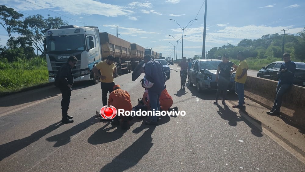 Um motociclista de aproximadamente 50 anos teve a perna dilacerada após ser atropelado por um carro modelo Uno na manhã desta segunda-feira (24) na BR-364, próximo ao Tênis Clube, em Porto Velho (RO).