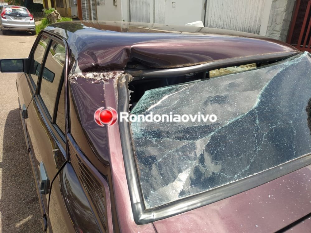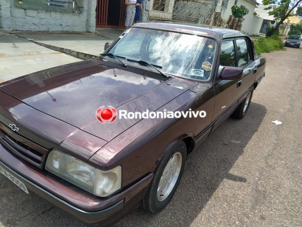 No vídeo é possível ver a concha do trator atingindo a traseira do carro modelo Opala de quatro portas que pertence a um colecionador e estava devidamente estacionado na frente de casa