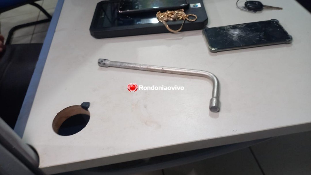Não satisfeita, a acusada ainda mordeu o braço do namorado e agrediu ele na cabeça usando a chave de roda. O homem saiu correndo e pediu ajuda em uma residência.