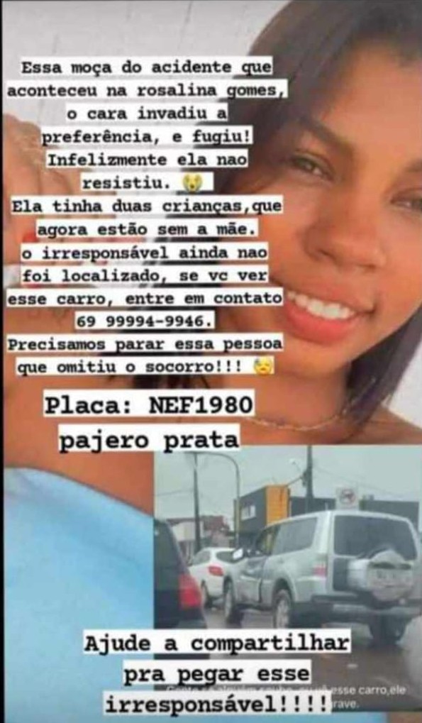A jovem Dandara Lima da Silva, 24, morreu após grave acidente de trânsito ocorrido no último dia 25 na Rua Rosalina Gomes com Anchieta, bairro Mariana, na zona Leste de Porto Velho (RO). A ocorrência de comunicação da morte da vítima foi feita neste sábado (28) na delegacia de Polícia Civil.