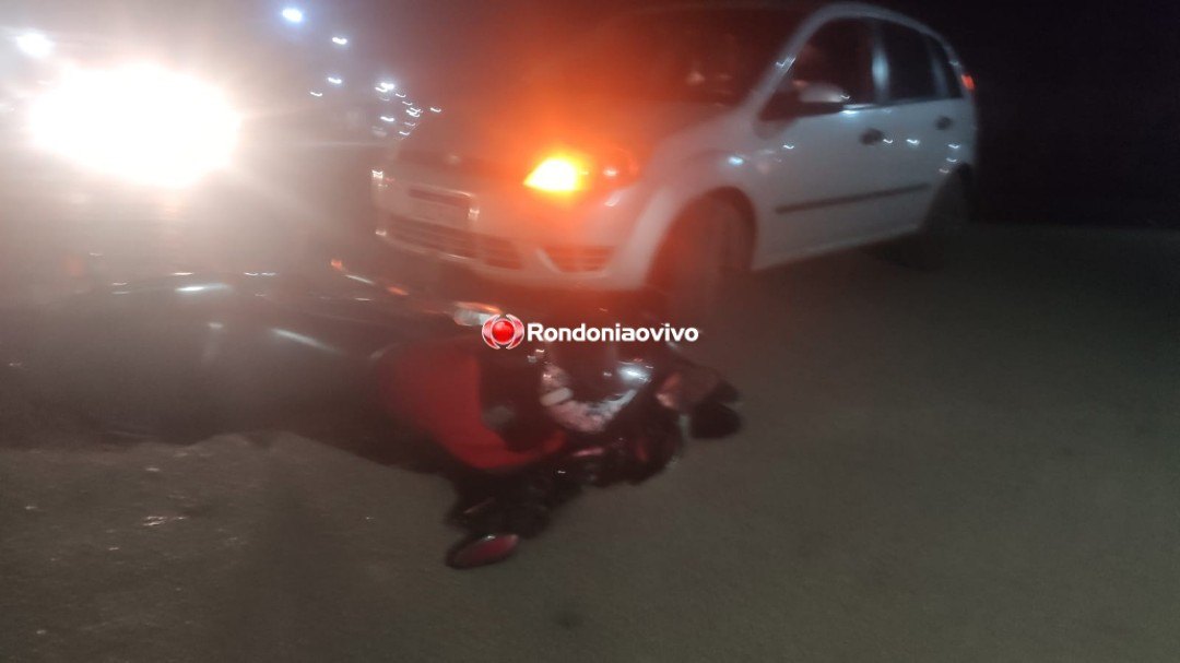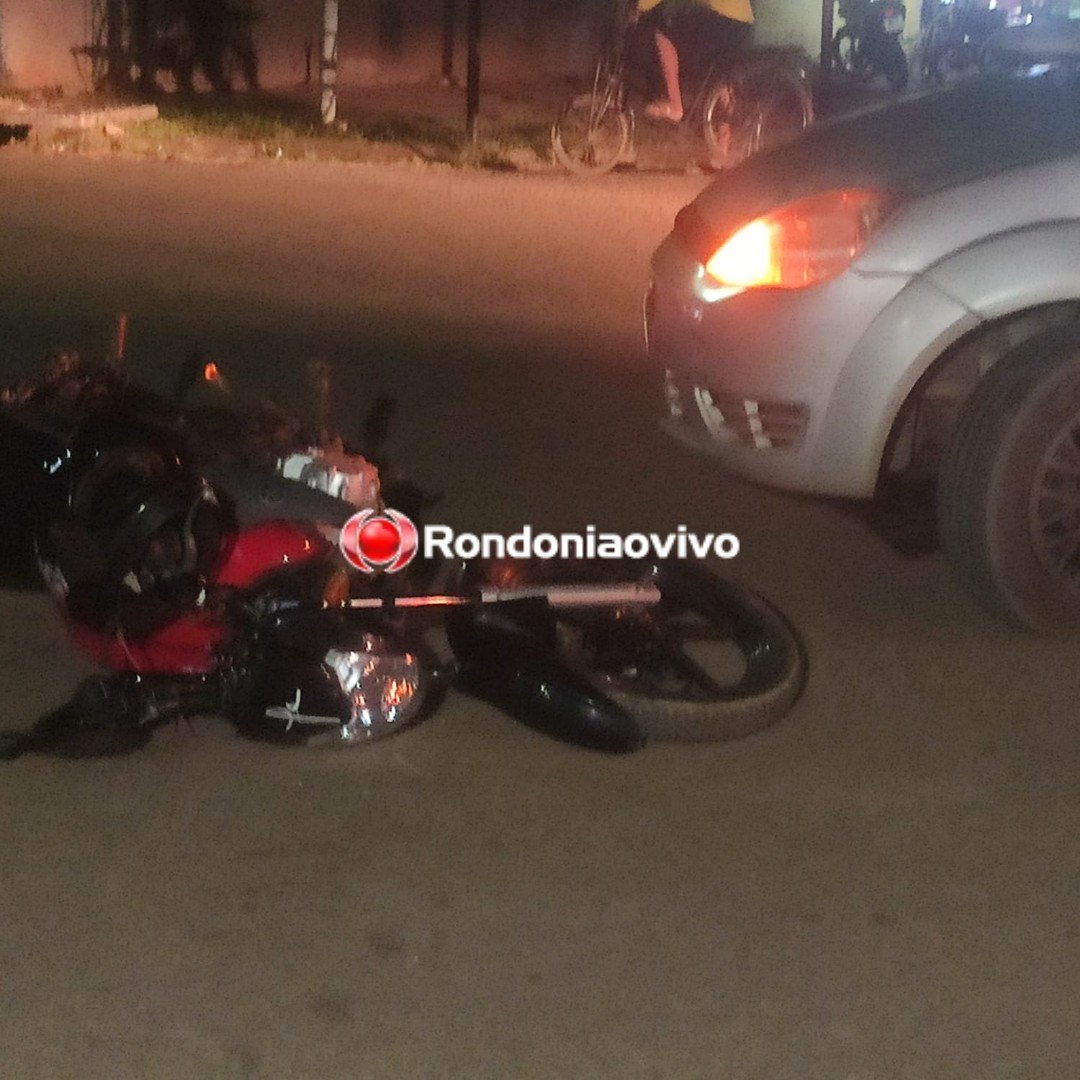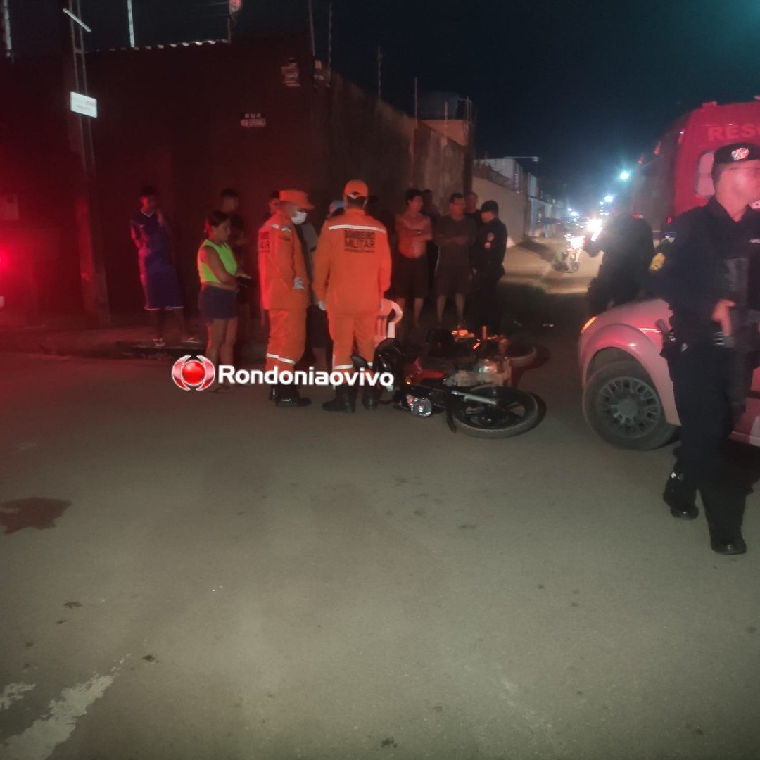 Uma motociclista foi socorrida pelo Corpo de Bombeiros após ser atingida por um carro nesta noite de domingo (12) no cruzamento das Ruas JK com Nova Esperança, bairro Caladinho, na zona Sul de Porto Velho (RO).