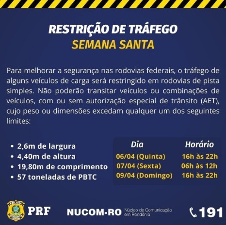 Haverá restrições para veículos de carga: na quinta-feira (06), entre as 16h e as 22h; na sexta-feira (07), entre as 06h e as 12h; e, no domingo (09), entre as 16h e as 22h.