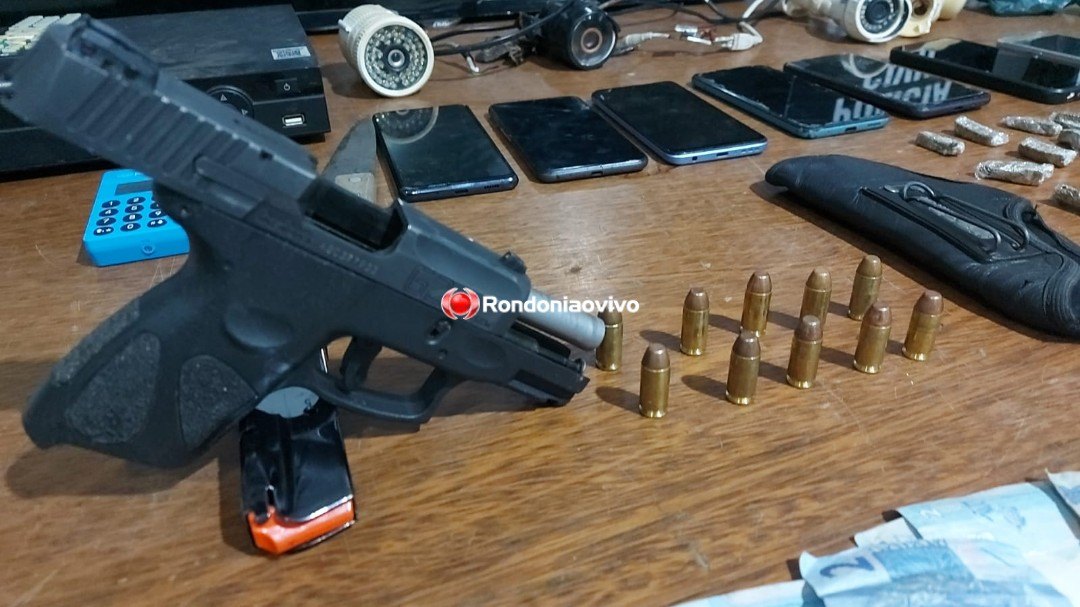 Os acusados foram flagrados com muita droga, uma pistola calibre .40, e outros materiais usados no tráfico. Os criminosos tinham até pagamento por QR code via pix, exposto na parede para receber o dinheiro da venda de drogas.