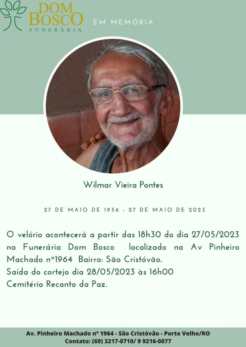 A Polícia Civil do Estado de Rondônia manifesta profundo pesar pela morte do agente de Polícia Civil federal, Wilmar Vieira Pontes, 67 anos, em decorrência de causas naturais, ocorrido nas primeiras horas deste sábado(27/05), em Porto Velho-RO.