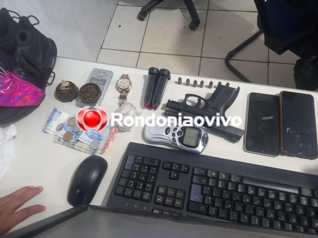 Na casa, os policiais encontraram uma pistola calibre 380, dois carregadores e sete munições, além de porções de maconha. O carro Kwid foi encontrado escondido nos fundos de uma casa na Rua Ibrahim Sued com Gabriela, bairro Planalto.