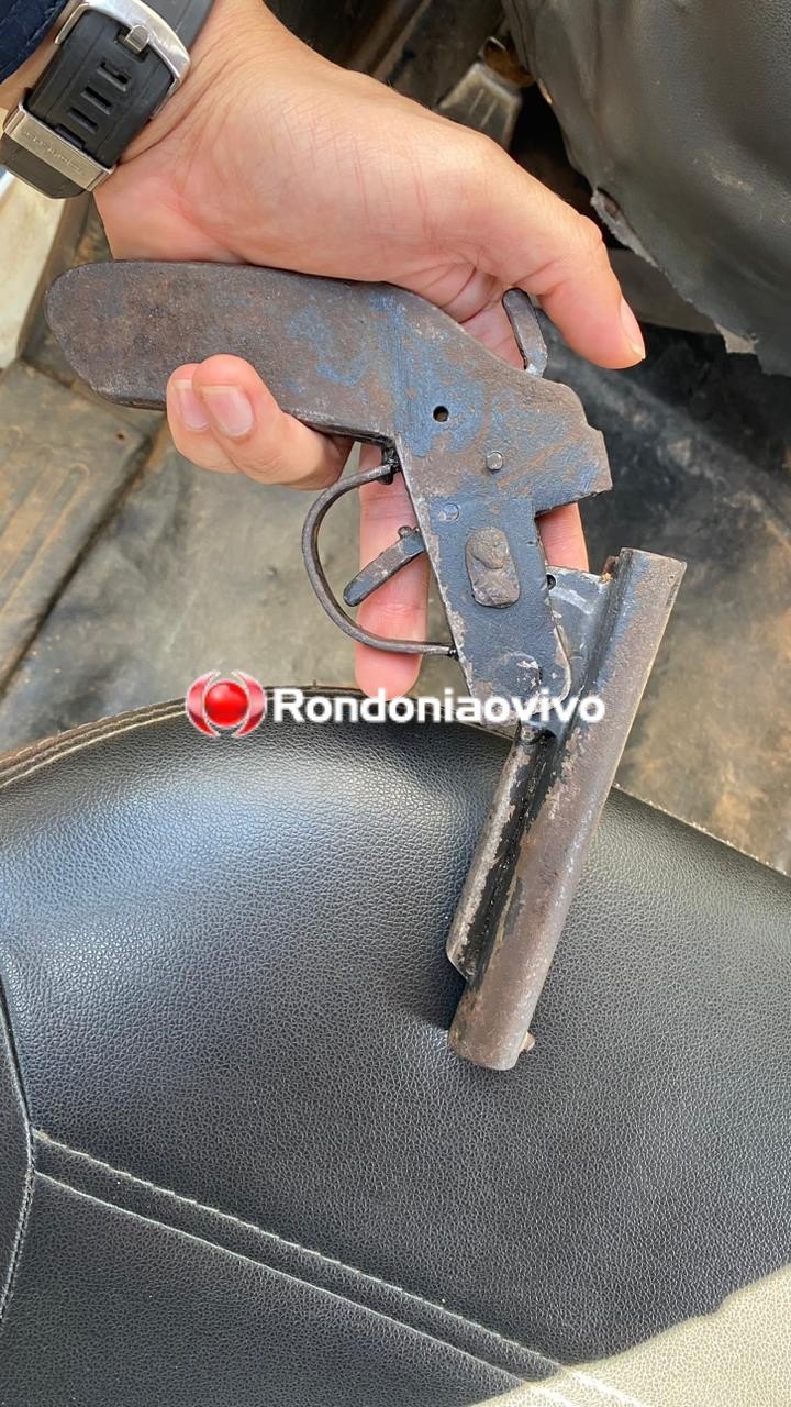 Uma arma de fabricação caseira foi apreendida, bem como porções de drogas. O carro modelo Gol não constava restrição.