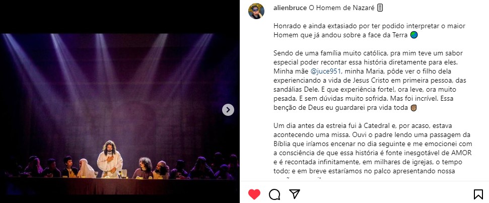 “Honrado e ainda extasiado por ter podido interpretar o maior Homem que já andou sobre a face da Terra. Sendo de uma família muito católica, pra mim teve um sabor especial poder recontar essa história diretamente para eles. Minha mãe, pôde ver o filho dela experienciando a vida de Jesus Cristo em primeira pessoa, das sandálias Dele”, comemorou ele à época.