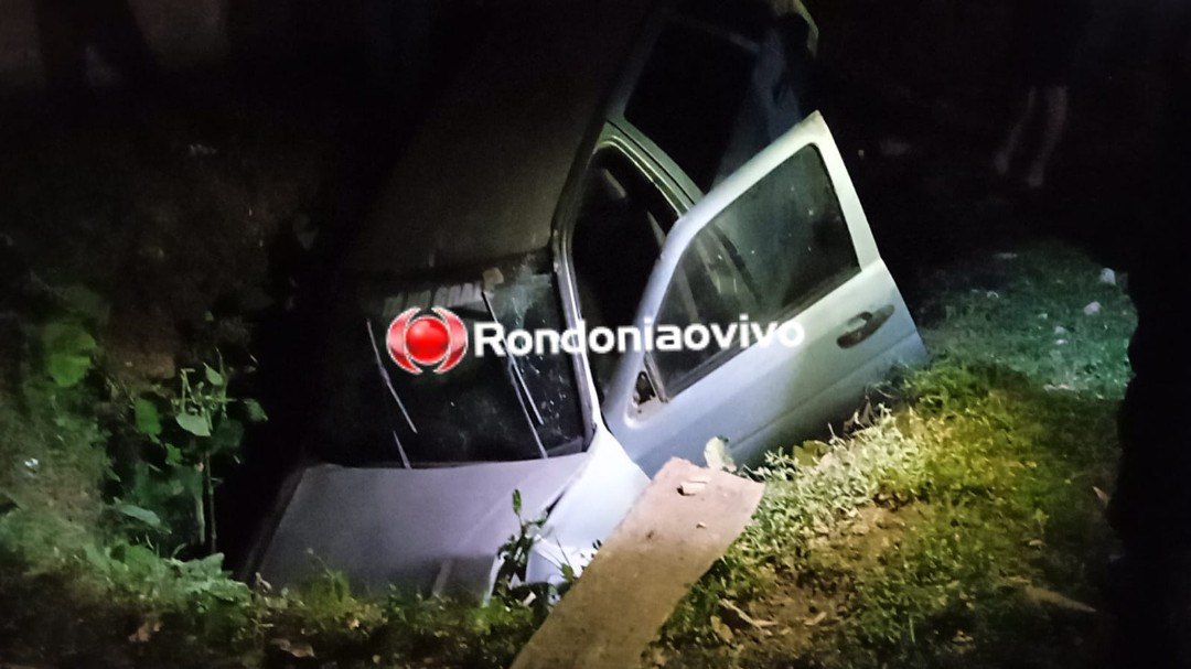 Com isso, o veículo destruiu o muro da casa e ainda caiu em uma buraco de uma fossa existente no quintal da residência.