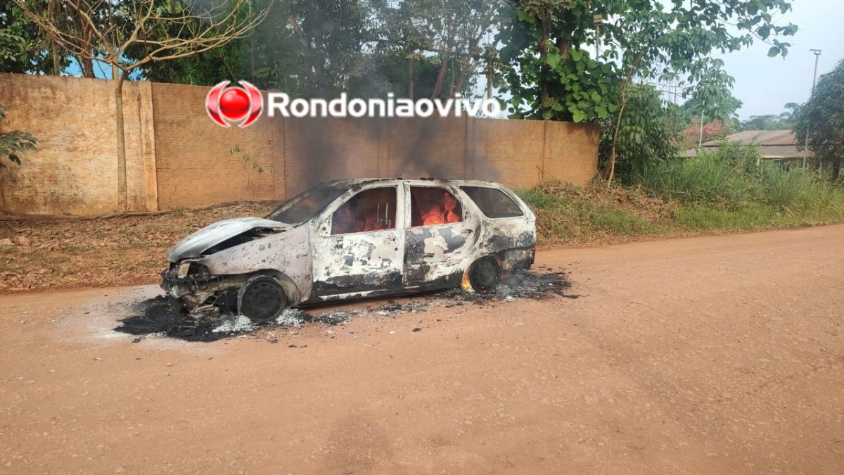 Um veículo modelo Pálio Weekend foi completamente destruído por incêndio na tarde desta quinta-feira (28) na Estrada dos Japoneses, zona rural da capital de Rondônia.