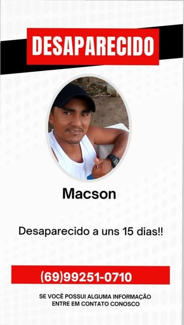 Parentes estão em busca de Macsoncleber Saraiva que está desaparecido há 24 dias; caso alguém possua alguma informação, pode entrar em contato com a família no número (69) 99251-0710