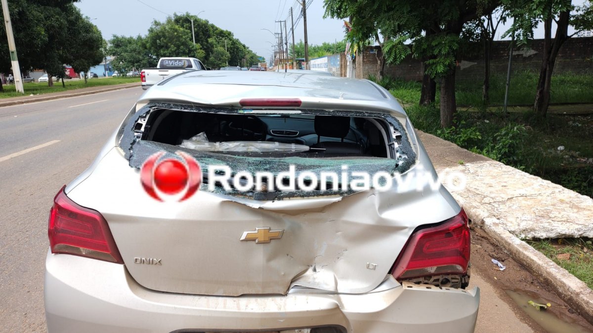 O motociclista bateu violentamente na traseira do Onix e ficou ao solo bastante ferido.