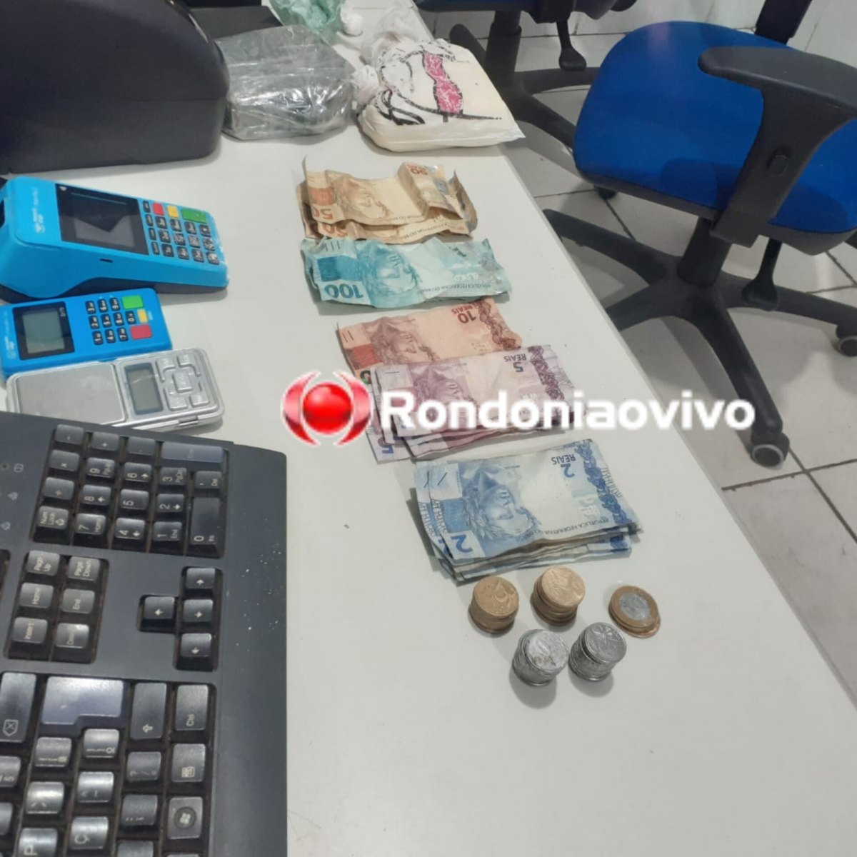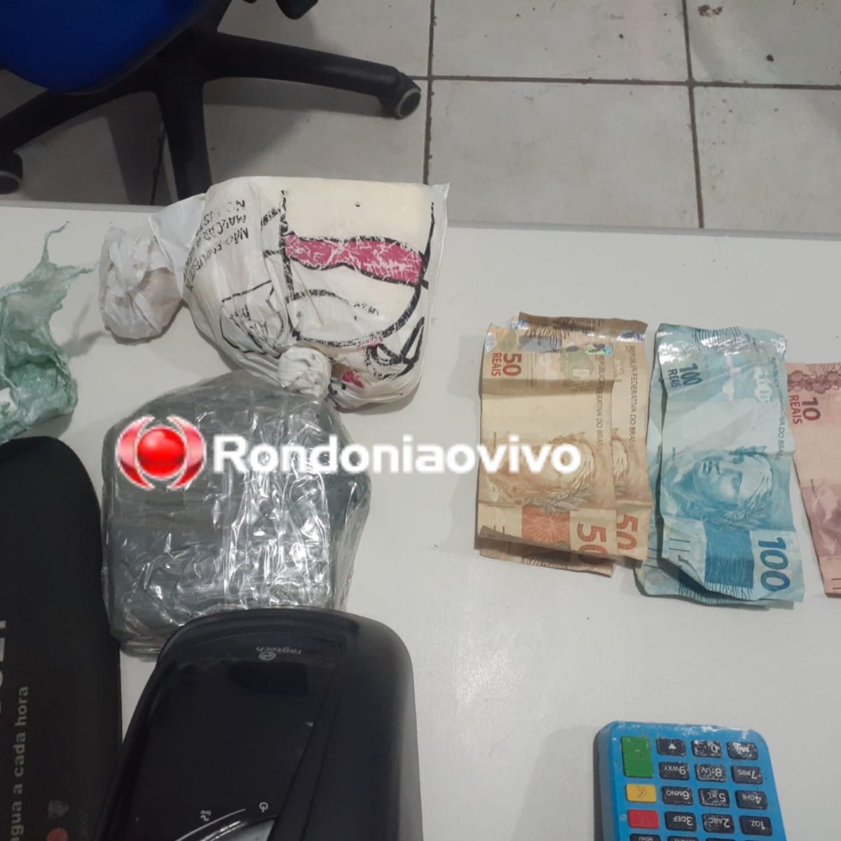 Ele foi abordado e durante busca na residência os policiais acharam mais dois tabletes de drogas e outras porções pequenas, uma balança de precisão, duas máquinas de passar cartão e cerca de R$ 450, 00 em dinheiro.