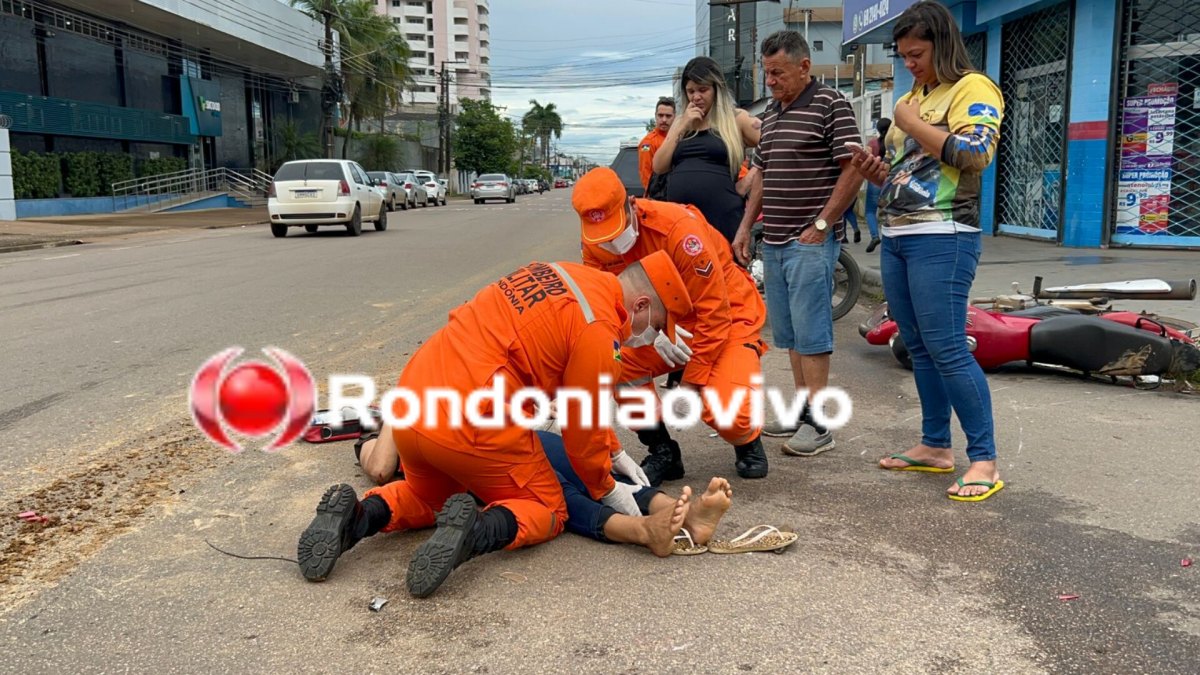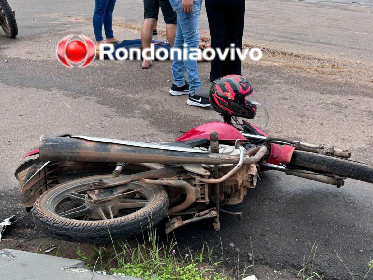 Devido a colisão entre os veículos, a mulher foi lançada ao solo e teve diversos ferimentos pelo corpo.