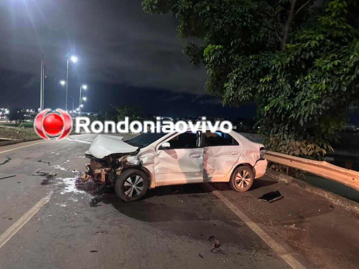 O motorista de um carro Cobalt de cor branca quase despencou com o automóvel do viaduto. A barra de proteção existente no local chegou a quebrar com o forte impacto.